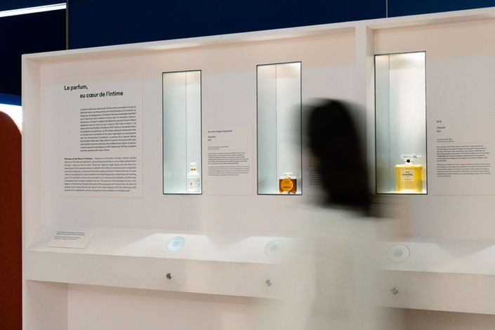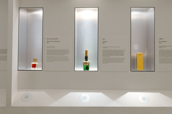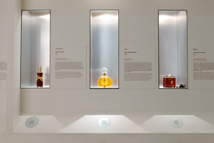 Parfums exposés : Eau de Cologne Impériale, Guerlain • Tabac Blond, Caron • N°5, Chanel • Joy, Patou • Femme, Rochas • Youth Dew, Estée Lauder • First, Van Cleef & Arpels • Opium, YSL • Anaïs Anaïs, Cacharel • CK One, Calvin Klein • J'adore, Dior • Baccarat Rouge 540, Maison Francis Kurkdjian • Brut, Fabergé • One Million, Paco Rabanne