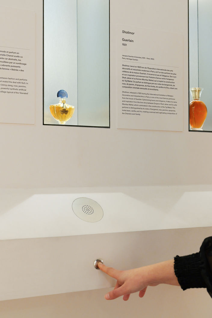 Dans un couloir menant à la nef du musée, quatorze parfums qui ont fait l’Histoire sont exposés tels des objets précieux dans des niches. À l’aide d’un bouton poussoir, les flacons s’illuminent et dévoilent leur sillage aux visiteurs, les plongeant dans des souvenirs olfactifs à travers les époques.